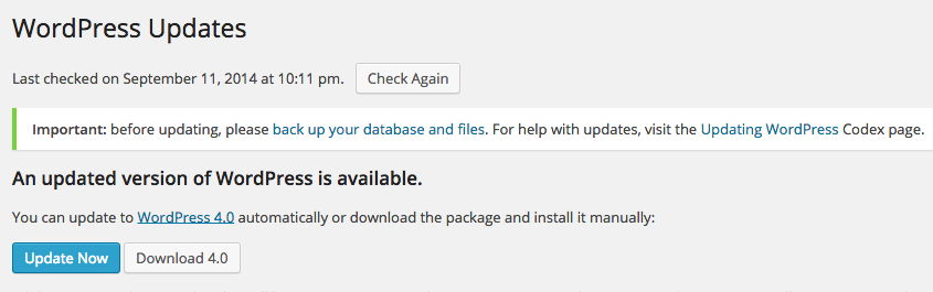 But, before you hit the update button, it’s always recommended to create a backup of your database and files. You will see a notification on update page as below: